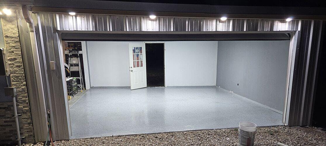 Another available option is the 2-part military grade topcoat, ideal for working garages or where fuels and solvents may come in contact with the floor. The 2-part military grade topcoat option is available at an additional charge.